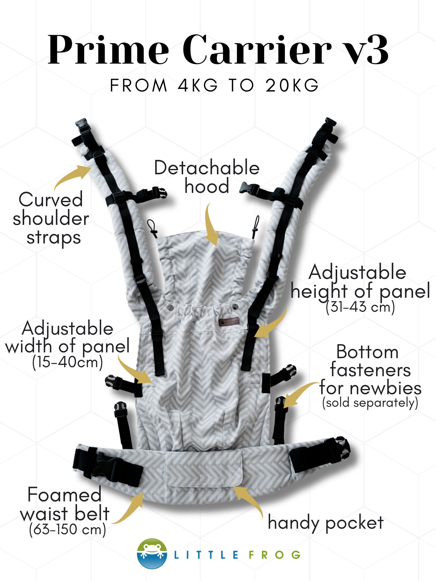 Kūdikių nešioklė „Little Frog Prime“ skirta tėvams, kurie ieško artumo nuo pirmųjų mažylio gyvenimo dienų, kad galėtų jį nešioti sveikai, ergonomiškai ir saugiai. ,,Prime” yra kūdikio nešioklė, kuri auga kartu su jūsų kūdikiu – ją galima lengvai reguliuoti ir pritaikyti, todėl ji puikiai tinka ir kaip naujagimio, ir kaip toddler nešioklė. „Prime“ puikiai tiks kaip kūdikio nešioklė žygiams ar kasdieniam naudojimui.