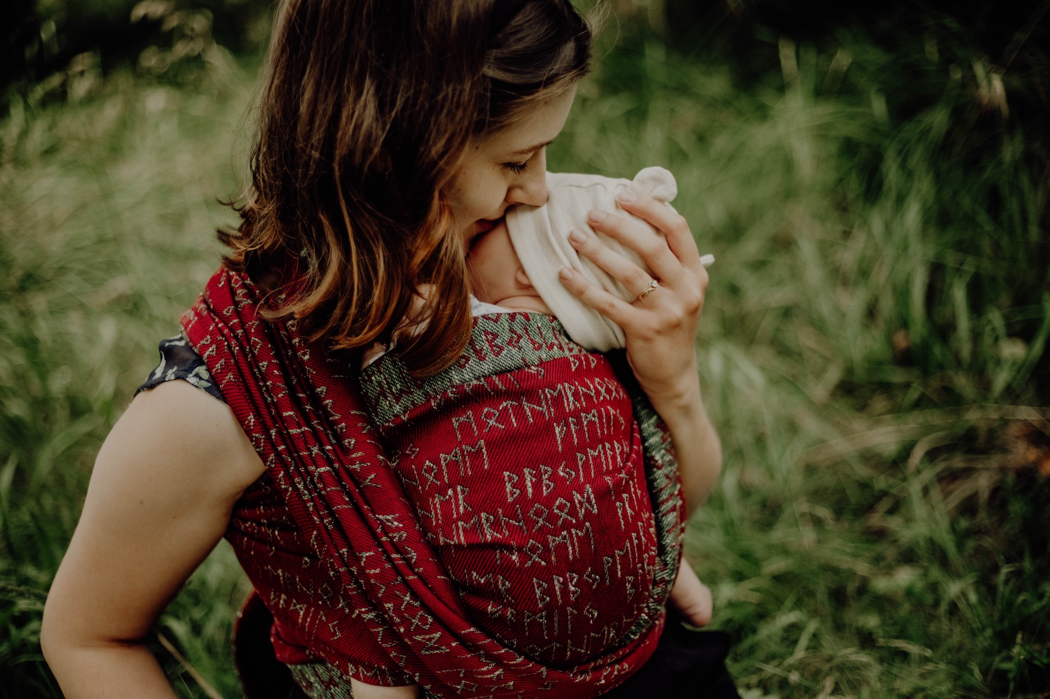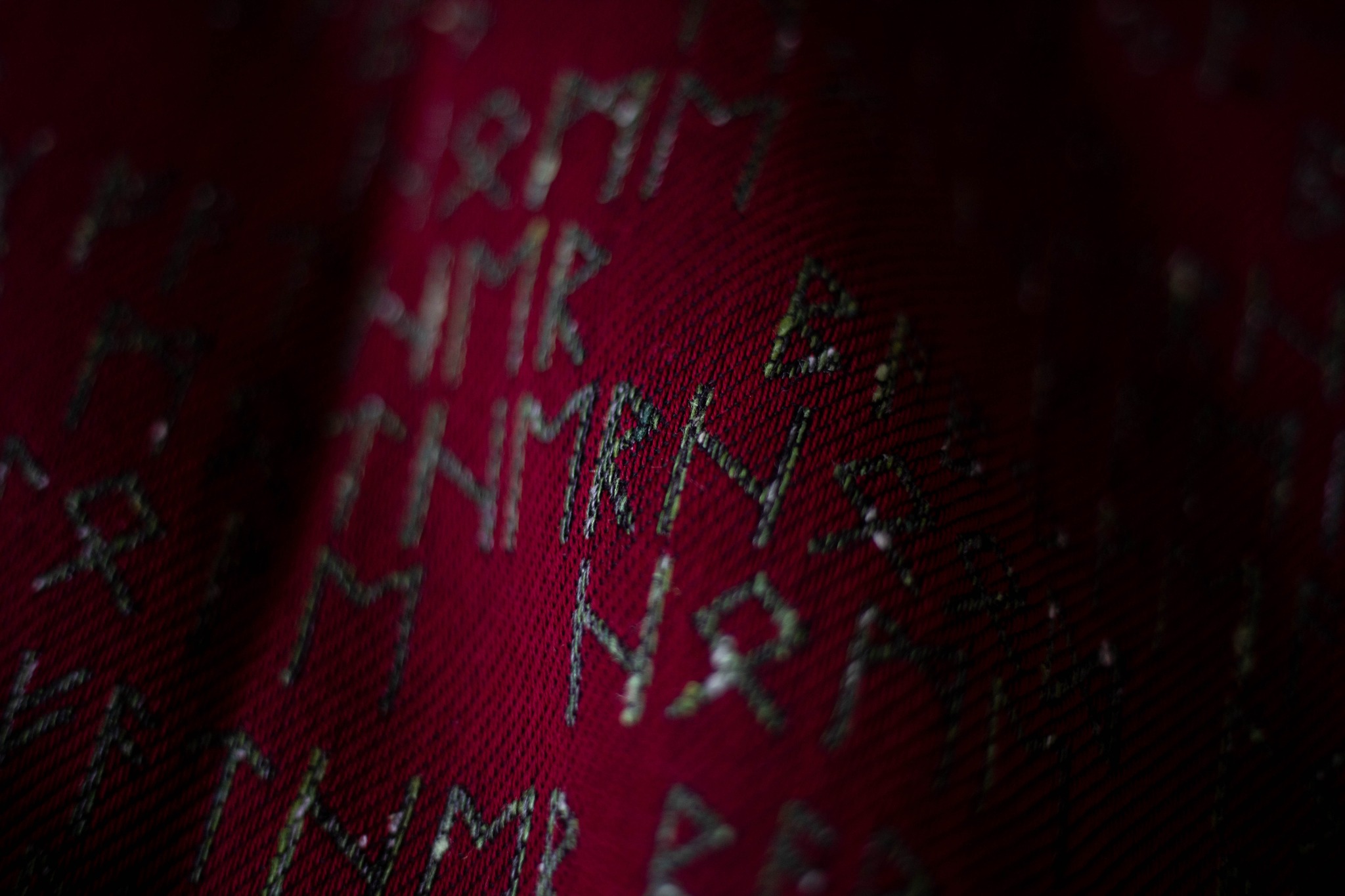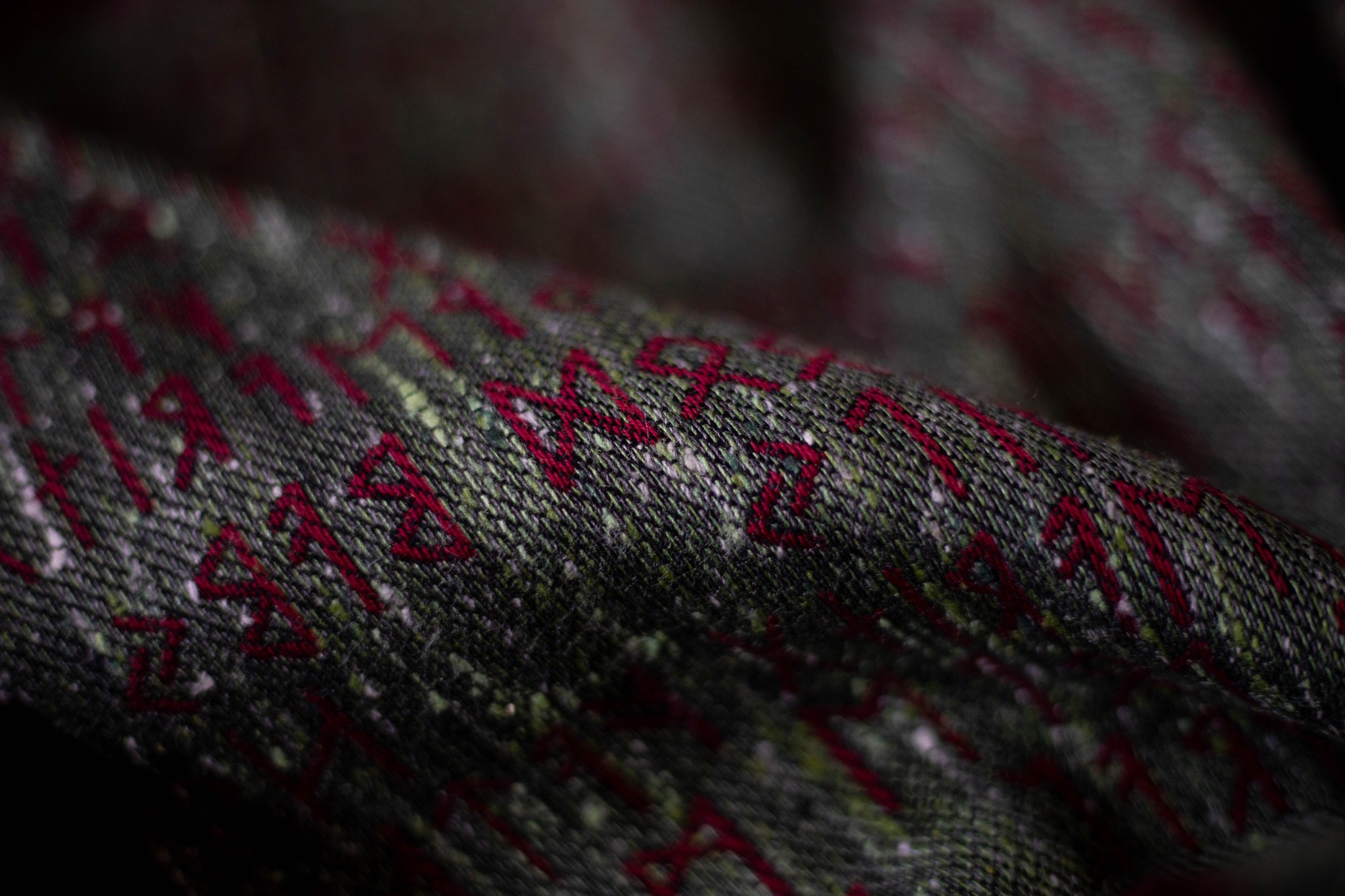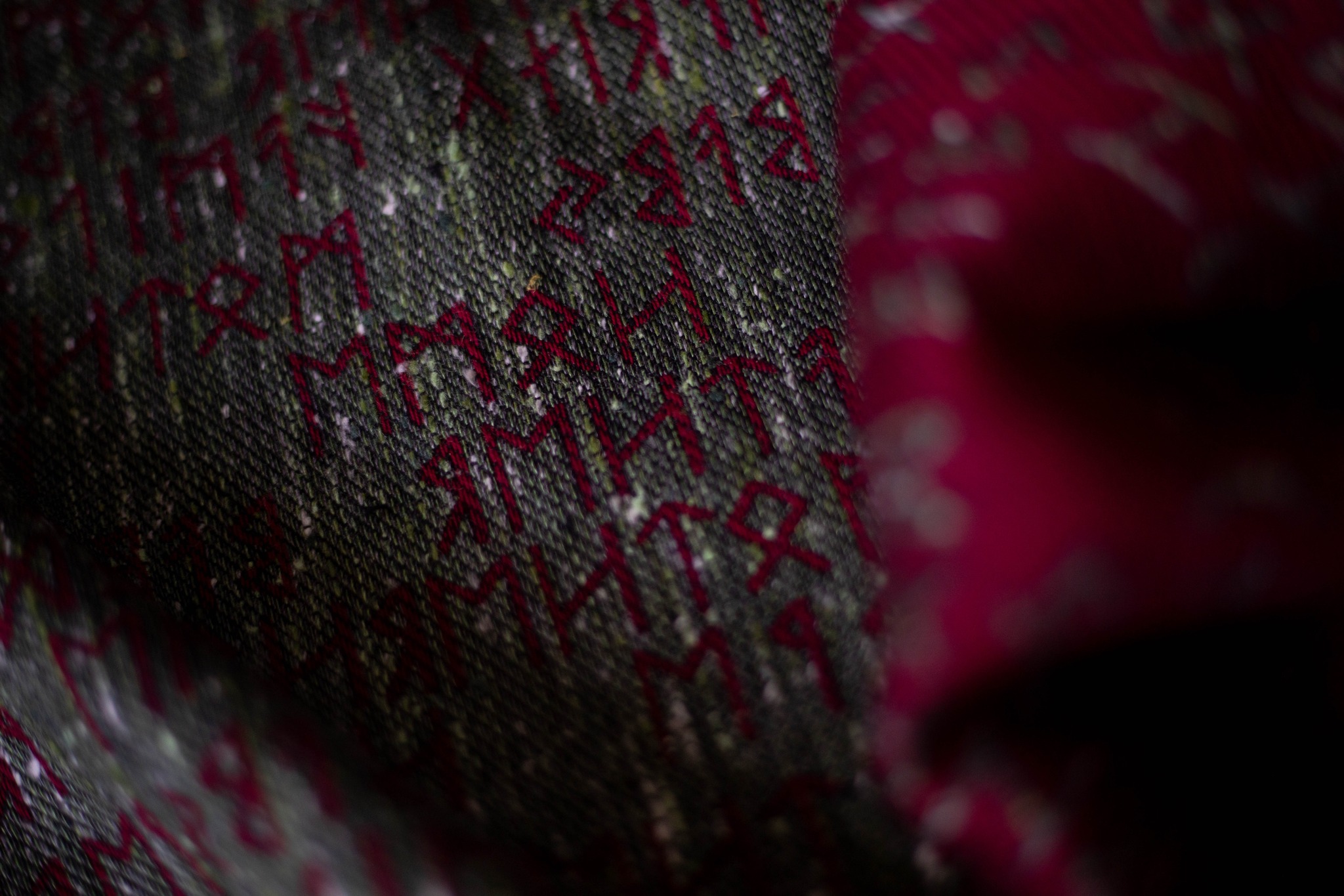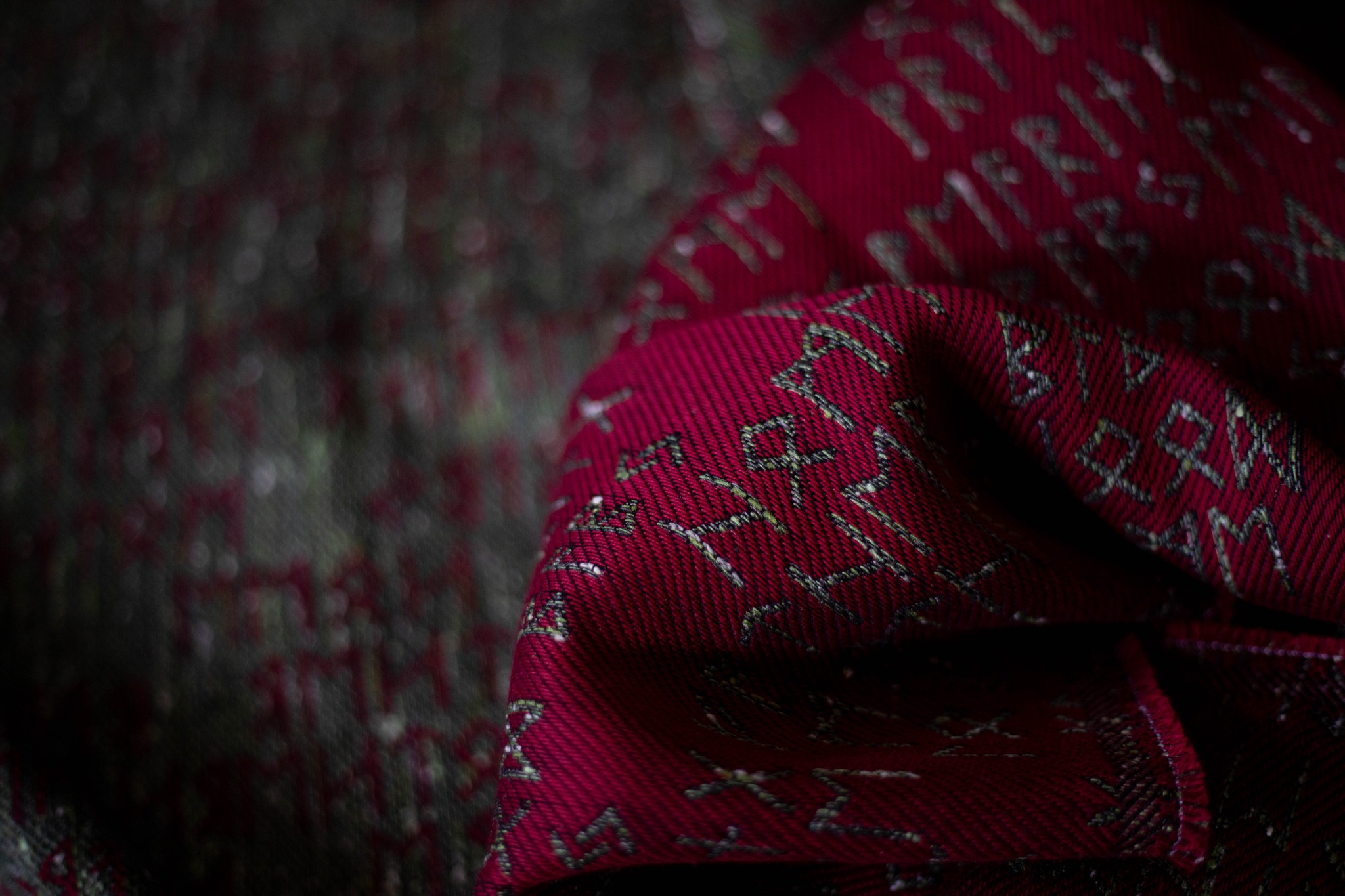 Runos labai populiarus Lulunos dizainas, įkvėptas vikingų kultūros. Čia ne šiaip runos išdėliotos, visi šie užrašai turi reikšmę. Po šiomis runomis slypi žodžiai ,,Motherhood, Love, Babywearing, Father, Mother, Baby, Family”. Šukuotinės medvilnės, tussah šilko ir shantung viskozės mišinys ypatingai purus ir minkštas. Labai smagiai gula ant pečių. Juosta įspūdingai atrodo iš abiejų pusių, tik raudona nėra tokia ryški kaip Lulunos promo nuotraukose. Turėdami šią juostą savo kolekcijoje tikrai nepasigailėsit.