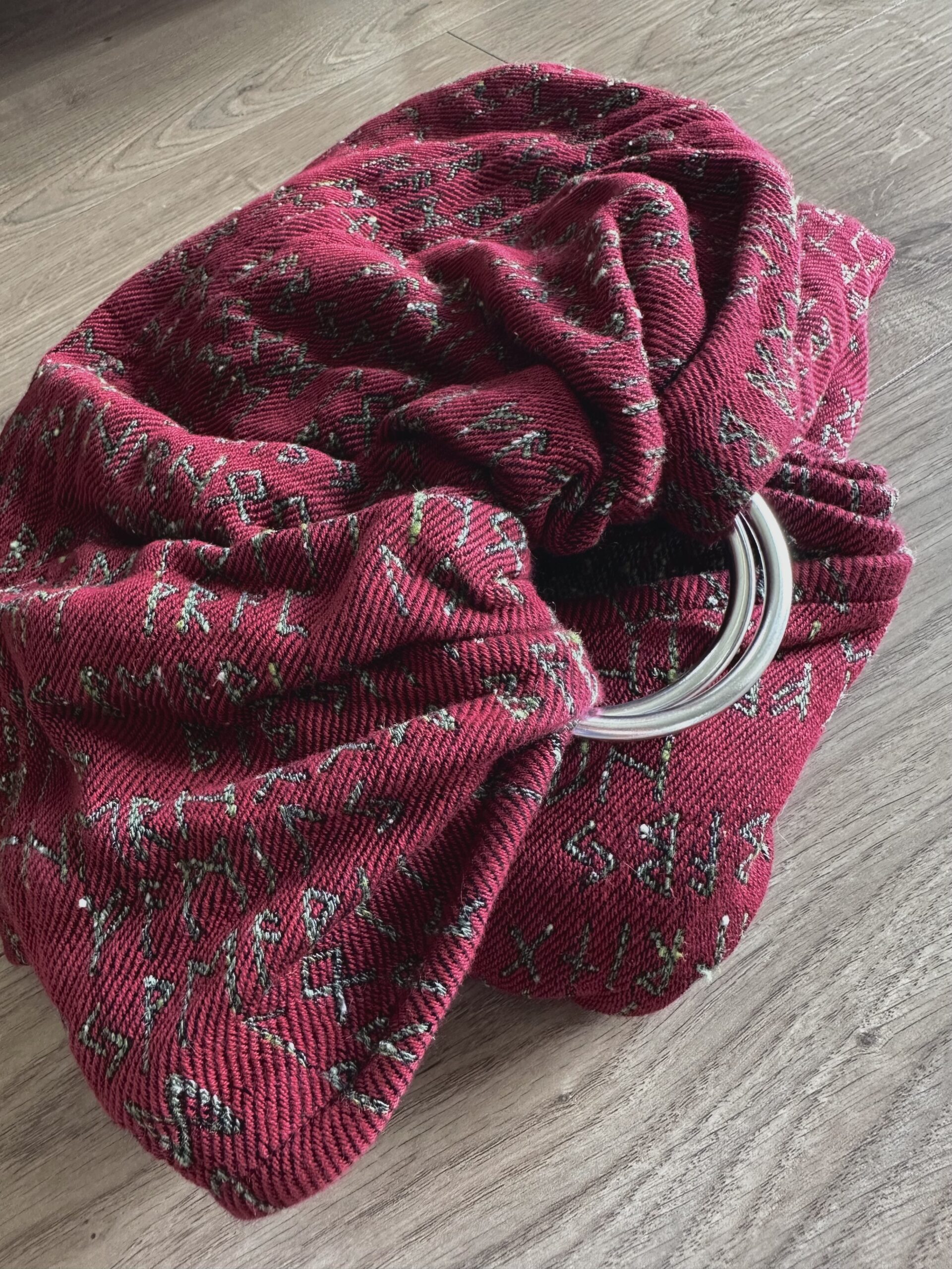 Runos labai populiarus Lulunos dizainas, įkvėptas vikingų kultūros. Čia ne šiaip runos išdėliotos, visi šie užrašai turi reikšmę. Po šiomis runomis slypi žodžiai ,,Motherhood, Love, Babywearing, Father, Mother, Baby, Family”. Šukuotinės medvilnės, tussah šilko ir shantung viskozės mišinys ypatingai purus ir minkštas. Labai smagiai gula ant pečių. Juosta įspūdingai atrodo iš abiejų pusių, tik raudona nėra tokia ryški kaip Lulunos promo nuotraukose. Turėdami šią juostą savo kolekcijoje tikrai nepasigailėsit.