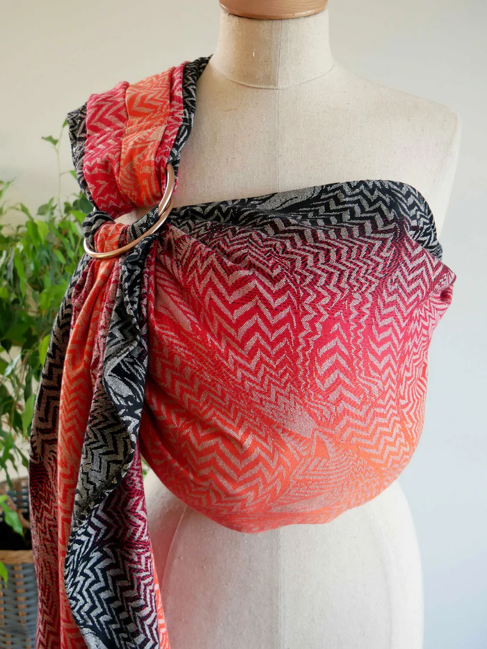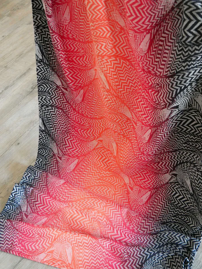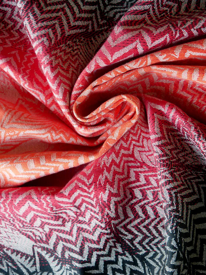 Šis ekologiškas audinys pasižymi perėjimu nuo gilios, paslaptingos juodos spalvos iki aistringos raudonos ir galiausiai raminančios oranžinės, o geometrinės lapės žaismingai šoka per audinį, sukurdamos vizualiai stulbinantį efektą.